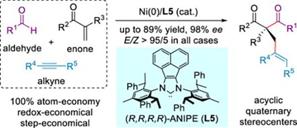 中国科学院上海有机化学研究所金属有机化学国家重点实验室施世良课题组长期致力于金属卡宾不对称催化领域研究。近期,该团队利用自主发展的ANIPE类手性氮杂环卡宾配体,实现了首例镍催化的醛-炔-烯酮三组分不对称偶联反应,利用简单易得原料经一步反应快速合成了非环手性季碳中心。该法成功避免了使用难于合成的三取代非环烯醇类化合物,通过炔烃、烯酮和镍催化剂的氧化环合形成七元环状烯醇镍中间体,发生对醛的不对称加成,进而发生β-H消除开环和还原消除,以100%的原子利用率合成了非环α-季碳手性酮类化合物。ANIPE配体的富电性和深手性口袋,不仅有利于提高反应活性,同时精准调控了反应的化学、区域和对映选择性。该成果发表于J. Am. Chem. Soc.(2022, 144, 130)。该反应为非环手性季碳的构建提供新方法,同时,该工作中的瞬态烯醇环策略为其他非环季碳手性中心的合成提供了新思路。