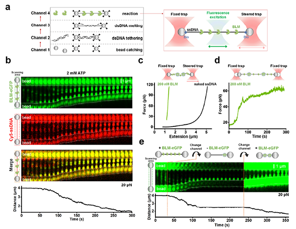 研究人员通过荧光光镊技术发现,BLM能够与ssDNA共凝聚并导致ssDNA的压缩,其在ATP水解的驱动下,可以抵抗数十皮牛的阻力(图2)。此外,BLM还能够通过移除与ssDNA结合的RPA或RAD51蛋白来压缩ssDNA,这也为BLM作为抗重组酶,参与同源重组修复过程中的抗重组功能提供了新的证据。进一步研究表明,单链DNA促进了动态阻滞的BLM凝聚体的形成,导致其可逆性明显降低。