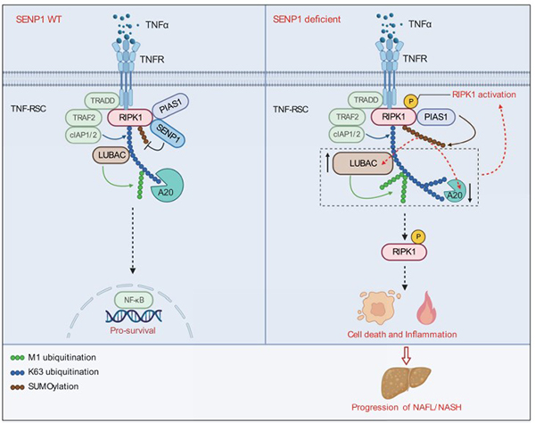 在这项研究中,作者通过小干扰RNA筛选鉴定出SENP1(一种 SUMO 特异性蛋白酶)为 RIPK1 的关键内源性抑制蛋白。他们发现SENP1的表达与NASH患者的病理程度呈负相关。在小鼠当中,肝细胞特异性SENP1基因敲除以RIPK1 激酶依赖的方式产生自发性的NASH相关表型。作者证明 SENP1 缺陷通过在TNF刺激后促进RIPK1的激活,使细胞对RIPK1激酶依赖的细胞凋亡更加敏感。机制上,SENP1 缺失会促进PIAS1介导的RIPK1的SUMOylation类泛素化修饰,RIPK1的SUMOylation修饰进而重新编排TNF受体超级复合物(TNF-RSC),通过下调去K63形式泛素修饰的酶A20,以及上调介导M1形式泛素修饰的LUBAC复合物来重新编程RIPK1的泛素化模式,并最终激活RIPK1,导致细胞死亡及炎症的发生。