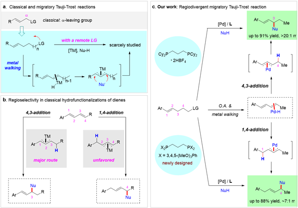 通过大量的配体考察,发现环己基取代的dppp类型双膦配体可以协同钯催化实现上述设计的历程,并且能够以高的收率和区域选择性得到3-位取代的烯丙基产物。另一方面,我们通过合成新的富电子的dppp类型双膦配体,能够调控实现共轭二烯中间体的1,4-加成,从而得到4-位取代的烯丙基产物(图1c)。这突破了常见的芳基取代的共轭二烯所参与的不对称氢官能团化会倾向于经历4,3-氢官能团化的常识(图1b)。目前相关的不对称催化转化历程仍在探索中。