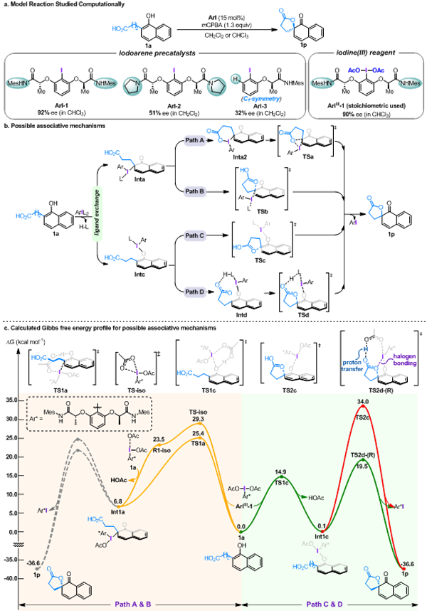 长久以来,高价碘介导的苯酚去芳构化的反应机理存在着争议。从宏观上,反应机理可以分为三类:缔合机理(associative pathway)、解离机理(dissociative pathway)和自由基机理(radical pathway),但是解离机理或自由基机理中产生的游离酚氧鎓离子或者酚氧自由基无法实现立体选择性的去芳构化历程,反应只有经历缔合机理才有望实现不对称去芳构化反应。以柔性芳基碘催化的萘酚去芳构化反应为例,对于缔合机理的具体历程,文献又报道了以下三种机理(图1,Path A~C)。薛小松课题组通过理论计算发现,文献中所提出的三种机理反应能垒都较高(> 25.0 kcal mol-1),无法较好地解释反应现象。经过细致的分析与探索,该课题组揭示了一种全新的苯酚去芳构化反应机制:质子迁移耦合的去芳构化(proton-transfer coupled dearomatization, PTCD)机理。该机理表明底物羧基向高价碘配体的质子迁移对于促进反应至关重要,其能够同时增强芳基碘的离核性与羧酸的亲核性,从而显著降低反应能垒。