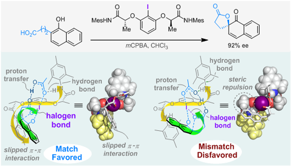 中科院上海有机所有机氟化学重点实验室薛小松课题组(https://www.x-mol.com/groups/xue_xiaosong)近日在J. Am. Chem. Soc.上在线发表了题为“Catalyst-Substrate Helical Character Matching Determines the Enantioselectivity in the Ishihara-type Iodoarenes Catalyzed Asymmetric Kita-dearomative Spirolactonization”的研究论文(J. Am. Chem. Soc. 2023, DOI: 10.1021/jacs.2c13295)。该工作对手性高价碘催化的萘酚不对称去芳构化反应的机理开展了详细的研究,提出了全新的反应机制与手性控制模型,并在此基础上对催化剂进行氟化,发展出具有更高选择性的催化剂。