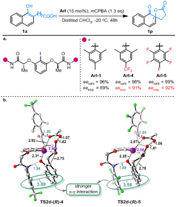 图3:设计合成的氟化的芳基碘催化的萘酚去芳构化反应及其过渡态