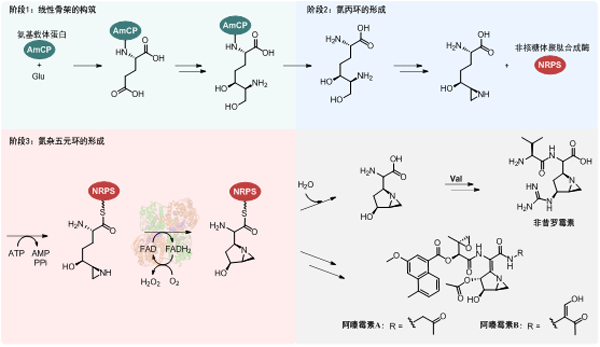 存在于一些非核糖体肽类天然产物中的1-氮杂双环[3.1.0]己烷结构往往赋予天然产物良好的抗肿瘤和抗菌活性:高张力的氮丙环的强亲电性可导致DNA烷基化。2008年,上海有机化学研究所刘文课题组报道了含该结构的阿嗪霉素的生物合成基因簇(Chem. Biol. 2008, 15, 693-705),并对其生物合成进行了探索。相关研究表明,氮杂双环结构单元的形成首先以谷氨酸为前体,在氨基载体蛋白水平进行线性骨架的构筑,接着在游离的氨基酸水平形成氮丙环。近期,上海有机化学研究所房鹏飞研究员和刘文研究员合作,报道了在非核糖体聚肽合成酶的协助下,氧化酶异源四聚体催化进一步环化,完成氮杂双环的形成。