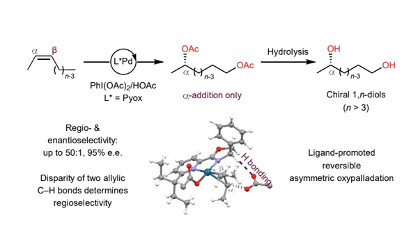 中国科学院上海有机化学研究所金属有机化学国家重点实验室的刘国生课题组发展了首例钯催化内烯烃的不对称迁移双氧化(ARD)反应,基于配体对反应动力学的调控,首次实现了内烯烃的高区域选择性官能团化反应;其中在吡啶-噁唑啉(Pyox)配体中吡啶C-6位上引入烷基基团是调控反应区域选择性的关键;该反应对于简单非活化的内烯烃和各种官能团取代的内烯烃均表现出非常优秀的区域和对映选择性,为高效合成1,n-手性二醇类化合物 (n>3) 提供了新方法。这些光学纯的手性醇不仅是有机合成中广泛应用的精细化学品,同样也是天然产物,医药和农药以及材料分子中常见片段之一。该工作于2023年4月27日在Nature Chemistry期刊在线发表(DOI:10.1038/s41557-023-01192-3)。刘国生课题组的李笑男博士和香港科技大学林振阳课题组的杨题隆博士是论文的共同第一作者,上海有机化学研究所为第一单位。