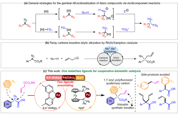 中国科学院上海有机化学研究所金属有机化学国家重点实验室王晓明课题组致力于研究多金属物种参与的反应体系,包括通过金属间电子传递、基团转移实现挑战性的转化过程和探究内在规律、仿酶的双多核金属催化剂的开发和金属团簇催化等。近日,在他们发展的配体修饰的双核铑催化重氮双官能团化的一系列工作基础上(J. Am. Chem. Soc. 2021, 143, 11799-11810; ACS Cent. Sci. 2022, 8, 581-589; Org. Lett. 2022, 24, 8423-8428; Chem. Eur. J. 2023, e202202820),进一步发现了单金属-双配体的新模式,通过双钯协同催化的方式实现了钯催化重氮化合物的多氟芳基-烯丙基化反应(Angew. Chem. Int. Ed. 10.1002/anie.202307973)。