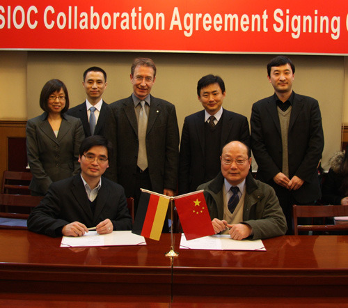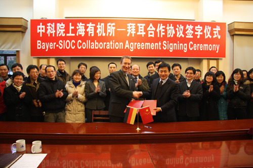 2010年3月3日,中科院上海有机所与德国拜耳公司合作协议的签字仪式在上海有机所举行。拜耳公司属下的先灵医药(Bayer Schering Pharma AG)全球药物研发部资深副总裁Hanno Wild教授,拜耳先灵医药全球药物探索中国创新中心总监马欣博士,拜耳先灵医药国际药物研发中国创新中心创新管理总监刘为民博士,上海有机所所长丁奎岭研究员,科研处赵小龙副处长及有机所合作项目组全体成员出席了签字仪式。签字仪式由项目负责人傅伟敏研究员主持。Hanno Wild副总裁和丁奎岭所长分别代表拜耳先灵医药和上海有机所在签字仪式上致辞。双方都对此合作项目给予了高度赞扬和评价,对合作双方富有诚意和成效的精诚合作表示祝贺和感谢,也对双方近十四年来的合作研究所取得的成果给予了充分的肯定。同时,双方对于未来在药物化学方面开展进一步的合作研究和在有机氟化学、金属有机化学等不同领域的合作研究充满了信心和希望。最后,双方共同祝愿上海有机所和拜耳先灵医药在未来建立起更加紧密、更加深入、更加广泛和双赢的合作。