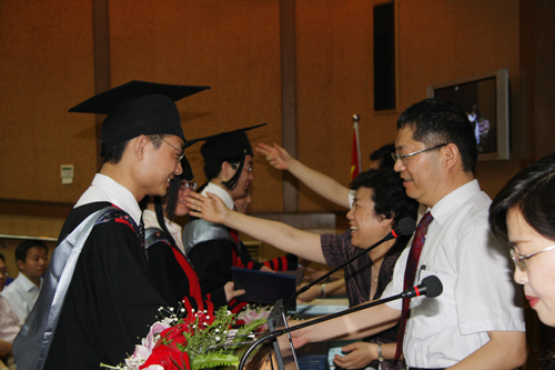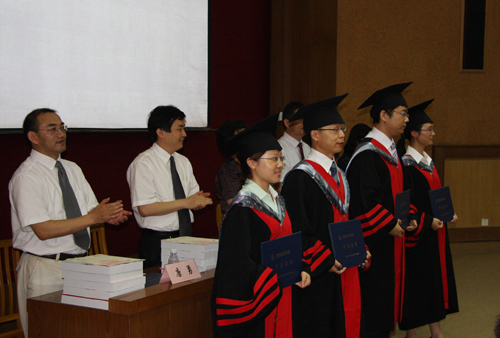 毕业典礼在雄壮的中华人民共和国国歌中开始。首先唐勇副所长宣读了有机所今年夏季毕业的58名博士生和8名硕士生名单。接着,毕业生们满怀喜悦之情,在轻快的进行曲中,依次从郏静芳书记、丁奎玲所长、马大为副所长和唐勇副所长手中接受颁发的毕业证书。毕业典礼上,郏静芳书记还宣读了2010年度中科院三好学生、中科院优秀学生干部、中科院优秀毕业生和上海市优秀毕业生名单,并对获奖同学进行了表彰。