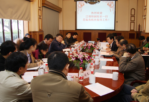 江绵恒副院长在听取了报告后作了重要讲话,对上海有机所近年来在科技创新,特别是在面向国家战略需求的高技术研究方面取得的新成绩给予了肯定,认为上海有机所“十二五”发展规划的思路、目标以及部署都很清晰,在进一步深化“三横三纵”的发展战略格局、推进实施“11-9-30”工程的战略部署以及方面等战略规划体现了“前瞻性、大科学和MOP(Multiple Open Platform,多重开放平台)”的理念。江绵恒副院长指出,目标清楚了,关键是怎么实现?有机所要以前瞻性的战略眼光,努力实践“三横三纵”的发展战略,为我国经济、社会的发展和国防安全做出新的贡献。要根据有机所自身特点探索实行“双轨制”式的发展模式,有机所在面向国家需求和科学前沿研究方面有着雄厚的底蕴和积累,这是有机所的宝贵财富。在基础研究方面要进一步体现前瞻性和国家需求的导向性;在面向国家战略需求的高技术和产业化研究方面,要发挥优势、突出特色;在体制机制方面,要整合资源,创新管理和评价机制,有效地体现科技创新的价值。科技发展是有客观规律的,只要遵循科技发展的客观规律并脚踏实地地去做,有机所一定能够实现可持续发展。