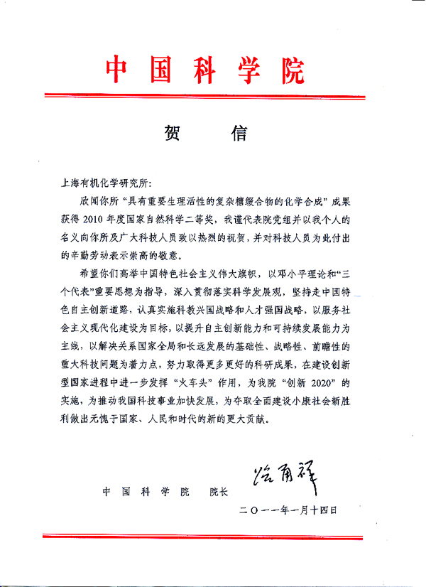 2011年1月14日上午,中共中央、国务院在北京人民大会堂隆重召开2010年度国家科学技术奖励大会。党和国家领导人胡锦涛、温家宝、李长春、习近平、李克强出席大会并为获奖代表颁奖。中国科学院上海有机化学研究所俞飚、惠永正、王来曦、邓绍江、卢寿福等人完成的“具有重要生理活性的复杂糖缀合物的化学合成”获得2010年度国家自然科学二等奖,上海有机所研究员俞飚作为获奖代表出席会议领奖。