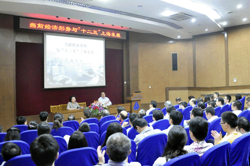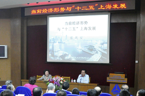 张兆安教授从中国宏观经济发展形势、上海市“十二五”发展要点两个方面解读我国经济形势与上海经济的发展。张兆安教授通过生动、诙谐的语言,丰富的内容、详实的事例和数据深入浅出地分析了中国经济发展“高增长、高产出、高消费、高出口”的运行特点与未来发展趋势,剖析了上海“十二五”建设“四个国际中心”和“现代化国际大都市”的总体思路,“创新驱动、转型发展”的发展主线和产业结构、板块调整、发展的新元素以及上海应对国内外错综复杂的经济形势的思路和政策。报告会现场还穿插了互动式的交流,气氛热烈,听众反响强烈。