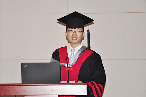 徐人奇同学代表全体毕业生发表感言:“还清晰记得2012年9月的那个下午,拿着新发放的学生证,看着上面印着‘有效期至2017年7月’,想着,这漫长的5年将会如何渡过。然而,这一千七百多个日日夜夜,弹指间,就这样匆匆流逝。5年的时间承载着我们太多的回忆:有工作发表时彻夜难眠的激动,也有课题不顺时反复尝试的迷惘;有与伙伴把酒言欢的时辰,也一定会有独自一人实验的深夜……无论今后遇到多大的挫折,都要勇敢的坚持;无论今后取得多大的成就,依然要坚持自己的初心,不骄不躁。我相信,今后,无论是继续深造还是工作,只要我们懂得坚持,一定能在自己的人生道路上绽放光彩!也一定能为祖国做出卓越的贡献!”