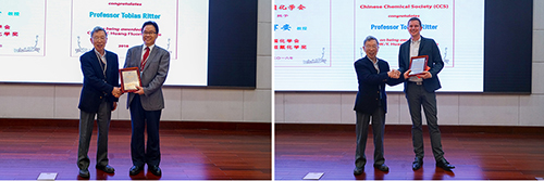 在本次会议上,举行了第四届“中国化学会黄维垣氟化学奖”的颁奖仪式。中科院上海有机化学研究所吕龙研究员介绍了“中国化学会黄维垣氟化学奖”的设立目的和历年颁奖情况,宣读了2018年度获奖者名单和获奖理由。中国氟化学领域开创者之一、首届“中国化学会黄维垣氟化学奖”(2012年度)获得者陈庆云院士向本届获奖者天津大学马军安教授和德国马普煤炭所Tobias Ritter教授分别颁发了“中国化学会黄维垣氟化学奖”奖牌和奖金。