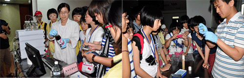 科普专题讲座结束后,黄岩实验中学师生们参加了上海有机所分析测试中心科普现场展示活动。康经武主任简要介绍了分析测试中心的基本情况,以及分析化学在人类日常生活中发挥的重要作用。随后,分析测试中心的科研人员向参观者展示了薄层色谱分析、液相色谱分析和化学发光分析等三个分析化学小实验。同学们兴致勃勃、热情高涨,在科研人员的指导和示范下认真观察实验现象,并提出了多个自己感兴趣的问题,研究人员用通俗易懂的语言生动地揭示了实验中的奥秘,充分调动了同学们的积极性和主动性。