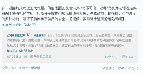 北京时间6月26日,神舟十号飞船顺利返航,天宫一号与神舟十号载人飞行任务取得圆满成功!今天中国科学院在其官方网站和官方微博上发表题为《中科院助力天宫一号与神舟十号载人交会对接任务》的新闻稿中,特别提到上海有机所在我国载人航天工程中所作出的重要贡献。