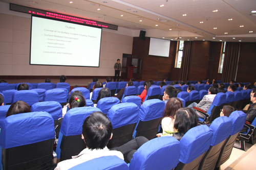 11月7日,应上海有机所交叉学科科学讲座的邀请,迟力峰教授到上海有机所进行学术交流,并在君谋楼报告厅做了主题为“Surface mediated unconventional polymerization”的学术报告。丁奎岭所长主持了讲座,所内一百余名科研人员和学生参加了讲座。