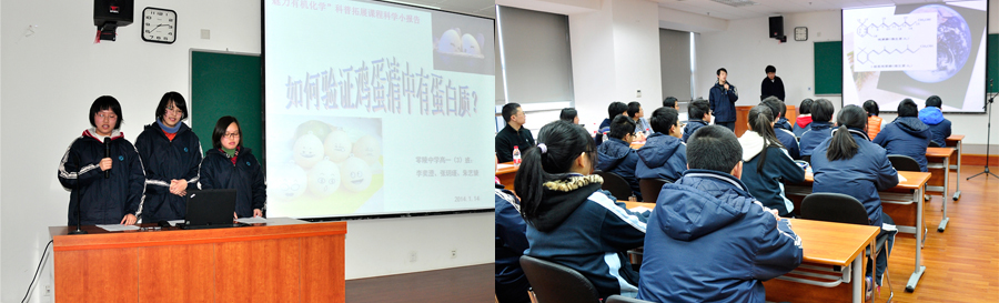接着来自上海有机所的科普志愿者周强、张媚和吴龙飞和零陵中学的同学们现场呈现一堂生动而有趣的科普微课堂,课程主题为“走进蛋白质的世界”。课堂的时间虽然非常有限,但是师生们共同漫步在蛋白质的世界,共同体会着蛋白质是生命的物质基础,它与各种形式的生命活动紧密相关,没有蛋白质就没有生命。通过趣味实验的探究,揭开了蛋白质的化学本质,了解了蛋白质的结构与性质;简易的烫发实验也让同学们感受了依据蛋白质性质的生活应用实例。课程结束后,零陵中学的李奕澄、张玥瑾、朱艺婕同学进行了课业展示,她们报告展示的主题是“如何验证鸡蛋清中有蛋白质?”,从平时观察到的现象“鸡蛋煮熟之后,蛋清为什么会由原来的透明澄清的胶质体变成白色固体呢?”出发,设计了双缩脲实验验证了蛋清中含有蛋白质,结合生活实际探讨了“生鸡蛋与熟鸡蛋哪个更营养”的问题,并给出了答案。课业汇报结束,零陵中学的章耀东、