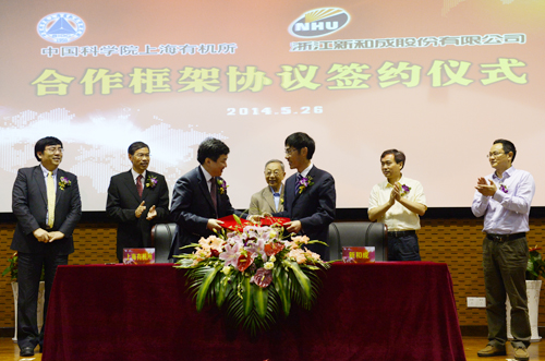 526日,中科院上海有机所—浙江新和成股份有限公司战略合作框架协议签约仪式在公司总部报告厅隆重举行。中科院上海有机所戴立信院士、所长丁奎岭院士、吕龙研究员等,新昌县县长马永良、新昌县县委常委副县长吴新宇、新和成董事长胡柏藩、总裁胡柏剡出席了仪式,仪式由浙江大学理学部常务副部长、新和成研究院名誉院长李浩然主持。