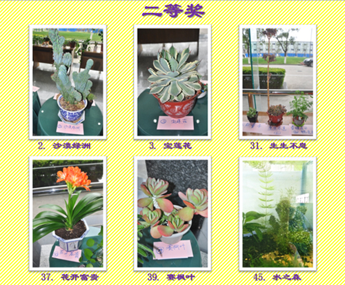 五十三株植物各有特色,创意十足。作品《绿色化学》将多种植物种植在实验室常用的锥形瓶、蛋形瓶中,并用铁架台造型成圣诞树的形状,将绿色植物融入实验生活,真是匠心独运;作品《逸趣玲珑》,鱼缸上层养殖各种多肉植物,下层五彩斑斓的小鱼欢畅游弋,上下两层动静相宜,相映成趣;还有许多特色植物《赛枫叶》、《沙漠绿洲》、《宝莲花》、《生生不息》,也令人大开眼界;正值花期的作品《兰》、《花开富贵》、《如意》,更是令人赏心悦目,微风拂过、香气袭人;这些绿意盎然、创意十足的植物,充分体现了“与植物相伴、让生活多姿多彩”,以及我们有机所职工对生活的热爱。