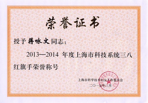 3月11日,上海市科技系统妇委在科技馆召开以“科技‘她’力量,携手创未来”为主题的纪念三八国际劳动妇女节105周年大会,表彰2013-2014年度全国巾帼建功标兵(文明岗)、上海市(科技系统)三八红旗手(集体)、关心女职工好领导、优秀妇委干部等先进代表。上海有机所蒋咏文副研究员在大会上被授予2013-2014年度上海市科技系统“三八红旗手”荣誉称号。