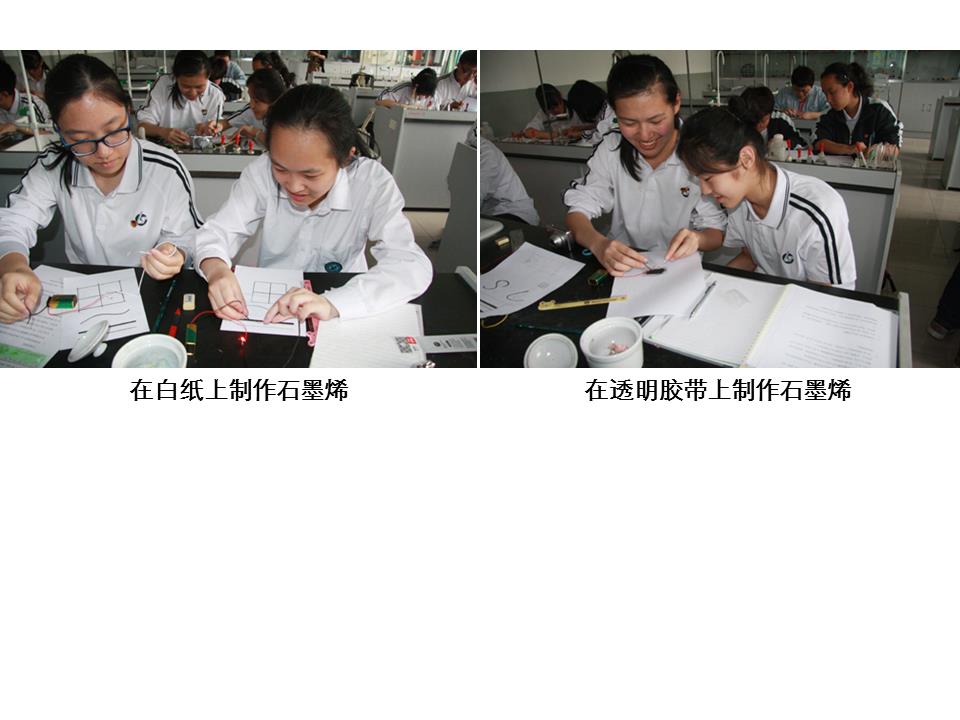 随后,在志愿者的带领下,同学们模拟最初石墨烯发现者的微机械剥离法,体验了“在透明胶带上制作石墨烯”的乐趣。用胶带剥离铅笔芯粉末的过程实际上就是在模拟石墨烯最初的制备方法—微机械剥离法。用小刀刮出6B 铅笔芯的粉末放置于白纸, 用透明胶带粘上铅笔粉末,用直尺将粉末刮均匀,从而在透明胶带上形成石墨烯薄片。