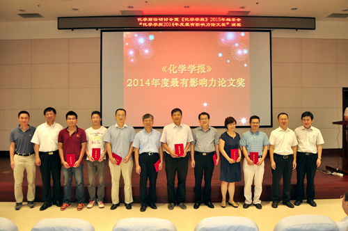 会议期间,还进行了“《化学学报》2014年度最有影响力论文奖”颁奖典礼,龚流柱、王官武、范青华等作者的10篇文章分别获奖,《化学学报》周其林主编,丁奎岭、张希、何川副主编向获奖作者颁奖并合影留念。“《化学学报》X年度最有影响力论文奖”主要奖励《化学学报》三年内(例如:2012-2014年)发表的,在该年度被引用次数较多的论文,一般奖励10个左右,奖励通信作者荣誉证书,第一作者奖金和荣誉证书。