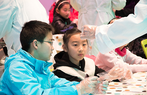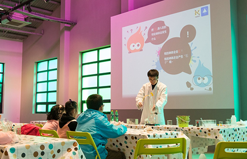 最后一个实验----二氧化碳大变身,真的是让小朋友们好好体验了一把舞台上大明星的感觉呢!这里用到的是固态二氧化碳,即干冰,它在室温下会变成气态的二氧化碳,舞台上的烟雾效果就是这样制造出来的呢!