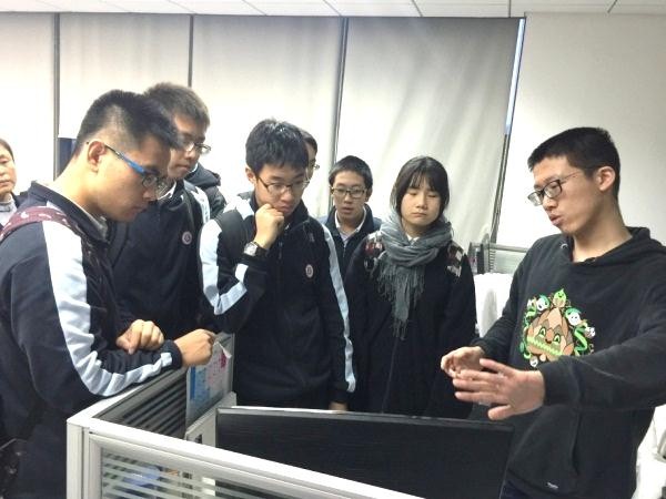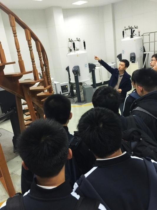兴趣组的同学们来到800兆核磁共振谱仪房间,认真听工作人员介绍仪器的组成和构造,得知仪器的磁场强度是地球磁场的37万倍时,纷纷惊叹不已。同学们又了解到医院里也有核磁共振仪,但不是用来测定分子结构,而是用来检查病人的大脑,能够看到很细微的变化,而且没有任何副作用,在医疗诊断中有着举足轻重的地位。接下来工作人员给同学们展示了乙醇、葡萄糖、维生素B2和蛋白质分子的一维氢谱,了解这一技术可以辨别分子内同一中元素的不同原子;正是这一灵敏的强大功能,帮助科学家们解析出复杂分子的结构。有了这种直观的感同学们又近一步了解了运用核磁共振技术解析蛋白质结构思路:核磁共振测出分子内氢原子间的距离,结合计算机软件模拟,得到符合实验观测数据的分子构象。虽然核磁共振技术很抽象,短短的一节课无法深入的了解,但还是激发了不少同学的兴趣,提出了一些有趣的问题,比如我们的仪器平时会关机吗,可以使用多少年,是不是每时每刻都要工作人员在场?工作人员为他们一一解答:仪器是高度自动化,只需要很少的人力维护,常年连续工作,甚至可以使用几十年。听到仪器如此方便,对科学技术的快速发展赞叹不已。
