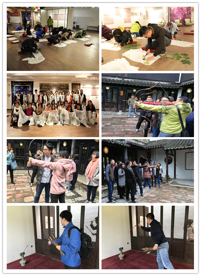 动在体验古法生活。动静结合两相宜,在参观完各类精致的艺术展品之后,职工们体验了工艺社举办的特色体验活动---叶拓染、古法射箭与投壶活动。刚拓染的丝巾散发出丝丝清香,让人禁不住裹上身;拉弓、瞄准、放弦,正中靶标总能引来阵阵喝彩;古老的投壶运动则是知易行难的代表,每每投进一支便能激发自豪感。每一项活动都强调了自主的动手能力,使人回归于自然,感受身心相结合相协调带来的成果。