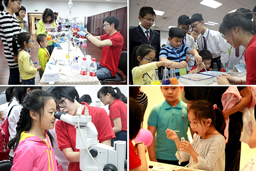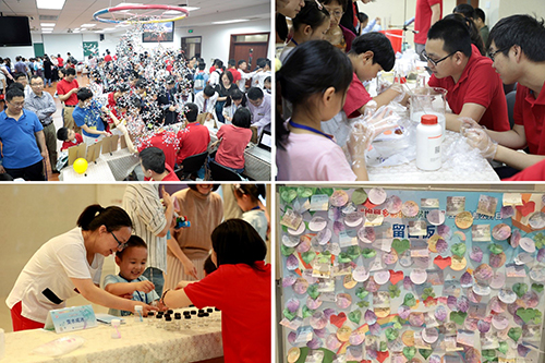 科普专题讲座结束后,同学们在志愿者的引导下参观了个6个趣味实验展厅,展厅里呈现一如既往的火爆,上下午迎来了超过1000位的社会公众。200余位志愿者精心准备了69个精彩的化学实验,液氮冰淇淋,自制泡泡水,彩色鸡尾酒,长毛的鸭子,酷炫风暴瓶,水果电池……这些实验现象明显,或颜色变化,或形态变化,但总是给予参与活动的孩子们意想不到的结果,加上志愿者们耐心到位的讲解,孩子们无不感叹化学的神秘和奇妙,在展台前久久不愿离去!“明年还要来!”许多小朋友都已不是第一次参加公众科学日活动了,活动结束时他们又依依不舍地相约明年再见,更在留言栏处留下自己深深的感悟和美好的祝福。