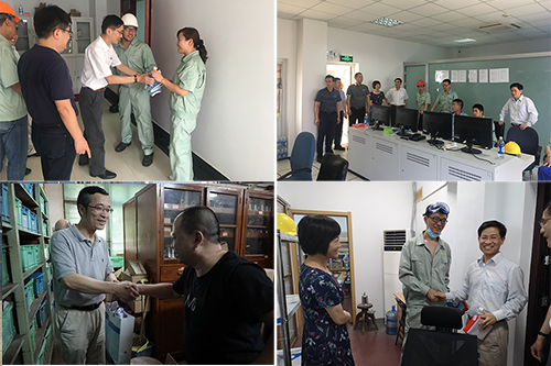 7月25日下午,中科院上海分院党组副书记、副院长田申荣一行冒着酷暑来到金山基地慰问奋战在生产一线的职工,刘菲及工会主席游书力等陪同慰问活动。领导们关切地询问了生产情况,了解大家的高温劳动保护措施,叮嘱大家合理安排作业时间,确保人身及生产安全。