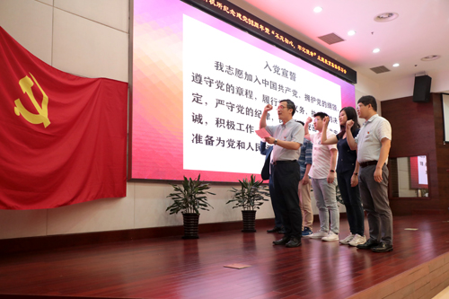 首先举行的是新党员入党宣誓仪式,在胡金波的领誓下,5位新党员面对庄严肃穆的党旗宣誓。全体党员起立,共同重温入党誓词。