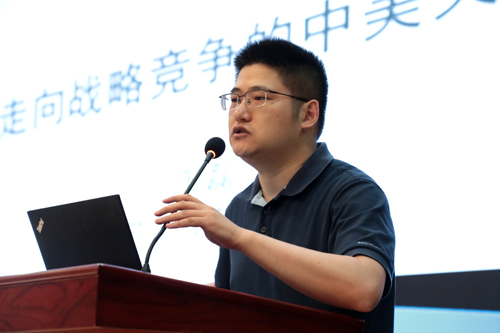 特邀嘉宾上海市委党校发展研究院、上海高校智库复旦大学宗教与中国国家安全研究中心兼职研究员邹磊副教授,以“走向战略竞争的中美关系”为题作专题报告。他从当前错综复杂的国际形势和中美近期的热点问题出发,运用大量详实数据和案例讲述了在当前这个“百年未有之大变局”形势下中美关系的重构与未来发展。整个报告具有很强的理论性和现实指导意义,使我们进一步了解了当前国际形势、开阔了视野思路。