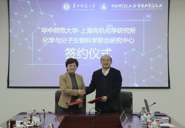 华中师范大学党委副书记陈迪明、化学学院院长肖文精,上海有机所党委书记胡金波、副所长刘文及双方单位职能部门负责人和有关专家出席了签约仪式和交流。