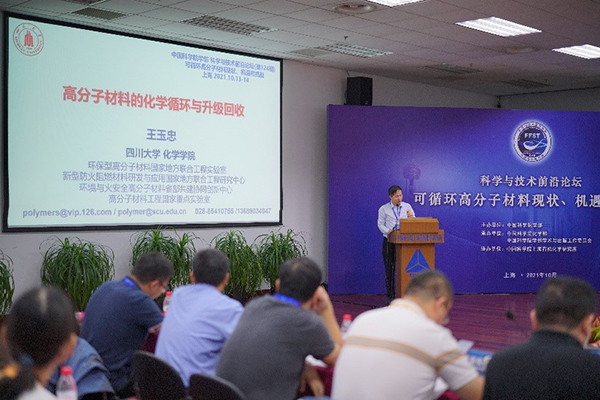 合成高分子材料被广泛应用于日常生活、交通运输、国防军工等诸多领域,其广泛使用已造成重大的环境挑战,如“白色污染”、资源浪费及碳排放增加等。我国是合成高分子生产和使用大国,面临的挑战更加突出。在大会报告环节,首先由唐勇院士作开场报告,介绍了本次论坛的背景与目的和实现高分子材料可循环的现状、解决思路、发展趋势以及面临的挑战性问题的个人观点。他希望各位专家在本次论坛中畅所欲言,集思广益,为我国可循环高分子材料的发展之路和研究方向积极建言献策。随后四川大学王玉忠院士、中国石化谢在库院士及中科院长春应化所陈学思院士等21位高分子合成与降解回收等研究领域的专家学者,为大会作学术报告,深入研讨该领域关键科学问题和发展方向。专家们齐聚一堂,共同就如何有效地解决废弃塑料回收利用、推动可循环高分子材料创制与应用的发展,为实现我国碳中和目标、从根本上解决“白色污染”问题以及为一些关键核心技术实现自强自立提供科技支撑等议题献计献策,共谋发展。在最后的圆桌会议上,参会代表围绕可循环高分子材料的现状、机遇和挑战进行了深入的讨论,最后王玉忠院士作了总结发言,并向参会嘉宾代表及工作人员表示衷心感谢。