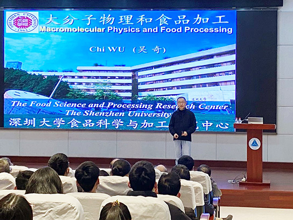 报告中,吴奇从小分子与大分子之间结构和性质差别出发,介绍了大分子的概念、分类以及大分子物理等方面的基础知识,同时对大分子溶液稳定机理、链长依赖性等提出自己独到的见解,并展示了其科研团队在大分子标度关系定量研究方面的创新性研究成果。之后报告转向天然大分子——植物蛋白和淀粉,吴奇从“能源和环境”以及“经济和政治”的视角详细介绍了素肉和土豆米两个食品科学与加工项目的重要性、市场前景和近期研究进展,强调了中国饮食文化——口感,基于大分子物理的科学原理和高聚物加工技术,获得了口感佳、易保存的素肉和土豆米产品。报告深入浅出,内容丰富,与会老师和学生会后进行深入讨论交流。