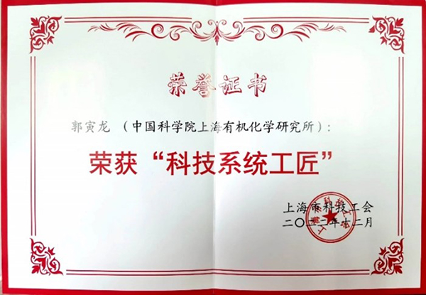 为推动落实《新时期产业工人队伍建设改革方案》、《科技系统工匠培养选树十年计划》(沪科工〔2020〕5号),努力造就一支有理想守信念、懂技术会创新、敢担当讲奉献的职工队伍,激发科技系统职工岗位创新活力,上海市科技工会决定选树命名一批科技系统工匠。上海有机所郭寅龙研究员荣获2022年度上海市“科技系统工匠”荣誉称号。