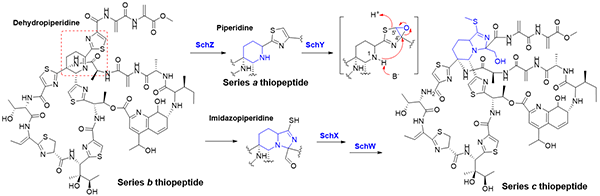 硫肽类抗生素是一类由微生物产生的核糖体肽类天然产物,大多具备良好的抗革兰氏阳性菌活性,在针对细菌耐药性研究方面得到越来越多的关注。硫肽类抗生素在结构上都包含唑杂环、脱水氨基酸以及一个以核心氮杂六元环为中心的大环。核心氮杂六元环是硫肽类抗生素的结构分类基础。依据其氧化态和取代基差异,可以将硫肽类抗生素分为a,b,c,d和e五种类型。在形成机制上,核心氮杂六元环均起始于[4+2]环加成反应,而后通过脱水和加氢形成b型硫肽脱氢哌啶环,若继续加氢则形成a型硫肽哌啶环;但若环加成后发生脱水和脱除前导肽,则会形成d型硫肽吡啶环,进一步羟化形成e型硫肽羟基吡啶环。目前,国际上对于a,b,d和e五种类型的硫肽生物合成途径已有较多研究;但对于核心结构为最为复杂的二氢咪唑并哌啶的c型硫肽,还缺乏在形成机制方面的认知。