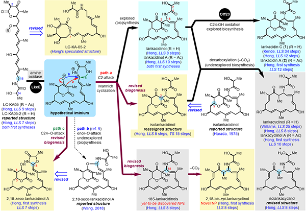 图示:兰卡菌素家族(lankacidins)的生源关系、仿生合成和结构修正