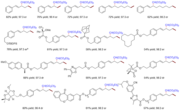 该反应对于不同的链长度和取代基均具有较为突出的结果,兼容复杂迁移体系的同时也能实现了较好的手性控制(图2)。另一方面,亲核试剂的pKa值与反应的活性密切相关。只有当亲核试剂的pKa值处于13-18间时才会有一个相对较高的反应活性。这是因为pKa值高的亲核试剂往往无法促进最开始的烯烃迁移的发生。而pKa值低的亲核试剂虽能有效实现金属迁移,但却具有相对较弱的亲核取代能力。