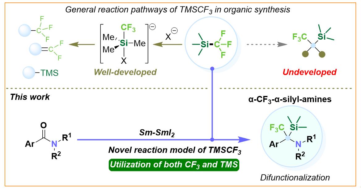 TMSCF3作为一种经典的向有机分子中引入含氟基团的试剂,自上世纪90年代以来引起了有机化学家与药物化学家的广泛的关注与应用。这一试剂在大部分情况下被用作氟碳源,在少数情况下也可作为硅基化试剂。考虑到硅基和三氟甲基都是重要的官能团,且硅基易于发生后续的转化,因此,若能将TMSCF3中的三氟甲基与三甲基硅基同时引入到产物分子之中,则可进一步增加原子经济性,并获得全新的产物结构。