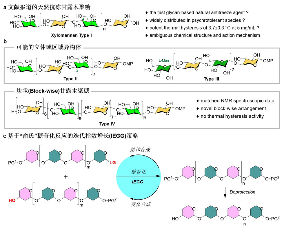 抗寒和耐寒生物在低温环境下产生抗冻分子以抵御体内冰晶生成和生长,从而避免带来的生理损害。这些抗冻生物分子主要为蛋白和糖蛋白。抗冻分子在生物医学领域,尤其是组织和器官的冷冻保存方面,具有重要应用前景。2009年,美国的Walters等人在《美国科学院院刊》(PNAS)报道了在阿拉斯加的一类甲虫中分离得到一种甘露木聚糖,并证明这是第一个非蛋白质的强效抗冻生物分子。随后,他们又在其它一些耐寒生物体内,包括昆虫、蛙类和植物等发现该类聚糖。随后,多个知名糖化学实验室,如日本的Ito实验室和美国的Crich实验室等,对该聚糖展开了合成研究以阐明聚糖的抗冻机制和发展新型抗冻分子。这些工作因为局限于聚糖短片段的合成,未能确证报道的甘露木聚糖结构和抗冻活性。