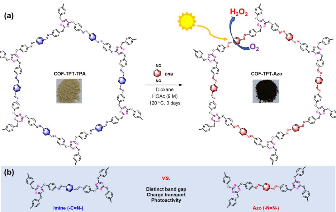 图1 (a) COF-TPT-Azo的合成及其光催化合成H2O2的示意图;(b) 不同连接键的性质对比示意图。