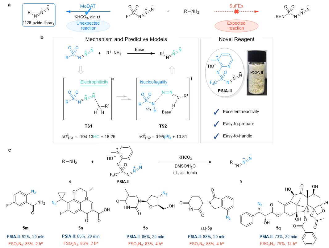 图(a) 氟磺酰叠氮对伯胺进行模块化重氮转移的意外发现;(b)重氮转移反应的活性预测模型和新型重氮转移试剂;(c) PSIA-II试剂用于天然产物和药物的快速修饰