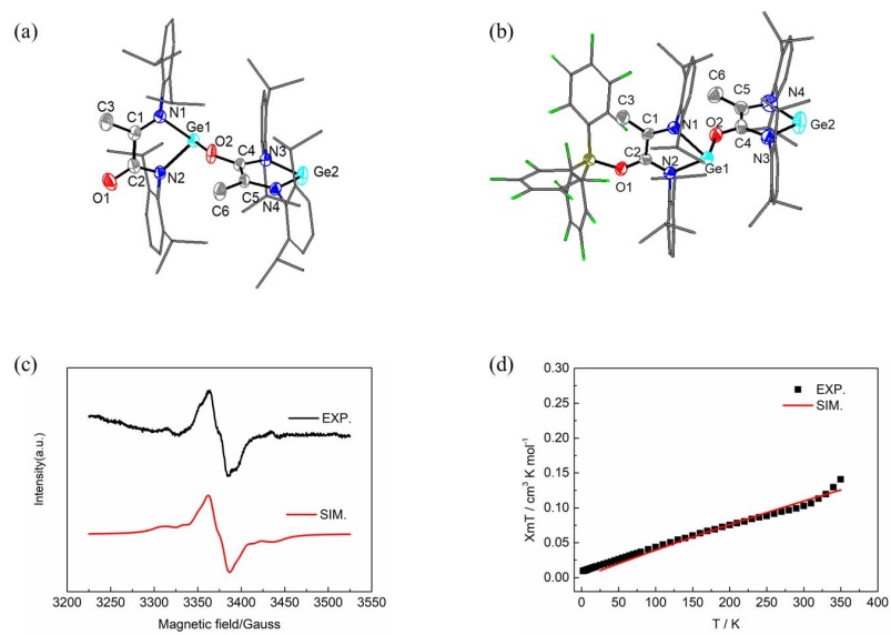 图4 双-锗宾4 (a) 和BCF配位的双-锗宾5 (b) 的合成过程以及5的EPR谱图 (c) 和SQUID谱图(d)