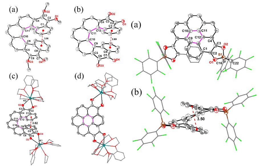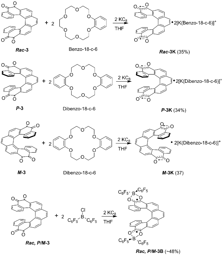 他们首先设计并合成了由邻二醌官能团化的[7]螺烯分子Rac-3及其对映异构体P/M-3 (图2)。通过对Rac/P/M-3进行化学还原分离出稳定的双阴离子及其对映异构体(Rac/P/M-3K)。在此基础上跟B(C6F5)2Cl反应,获得中性含硼螺烯双自由基Rac/P/M-3B。对这些化合物 Rac/P/M-3K和Rac-3B进行了单晶、EPR、SQUID以及紫外吸收光谱等表征(图3-5)。EPR和SQUID测试结果表明3K和3B的基态均为开壳层单线a态双自由基,与理论计算结果相吻合。