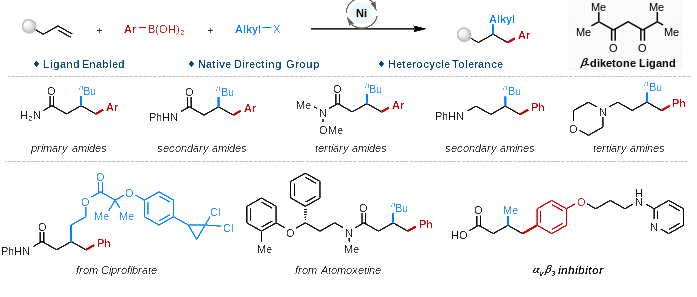 王鹏课题组利用β-二酮配体实现了镍催化非活性烯烃的芳烷基化反应,该反应条件温和,具有优秀的官能团耐受性和广泛的底物兼容性。含有原生官能团的烯烃底物,如一级酰胺,二级酰胺和三级酰胺衍生的烯烃都可以顺利得到芳烷基化产物,含有二级胺和三级胺的烯烃也可以顺利得到相应产物。此外,该方法也可以应用于生物活性分子的合成,进一步体现在合成中的应用潜力。