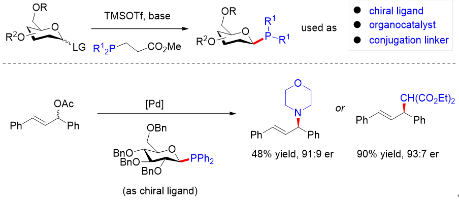 糖是一类优良的手性单元。一直以来不断有基于糖结构开发相关的催化剂或手性配体的研究。特别是,糖基膦配体也被认为是有潜力的一类手性配体。由于三价膦苷化反应尚未被实现,糖基膦配体的制备多是将膦单元直接连接在糖的羟基片段上而非糖的碳骨架上。近日,何智涛课题组基于前期膦试剂介导立体选择性双糖苷化的研究基础(J. Am. Chem. Soc. 2022, 144, 2460-2467.),设想利用具有亲核性的中性三价膦作为底物,直接参与膦苷化,形成四配位糖基膦中间体,再进一步脱掉一分子丙烯酸酯,即可方便地获得三价膦苷化产物。该过程操作简单,反应原料易于制备,可克级规模进行,能够方便地制备出多样化的糖基单膦配体。该类产物结构不仅可以作为手性配体使用,也可以用于活性分子的连接子,或者作为手性有机膦催化剂,表现出良好的应用潜力。