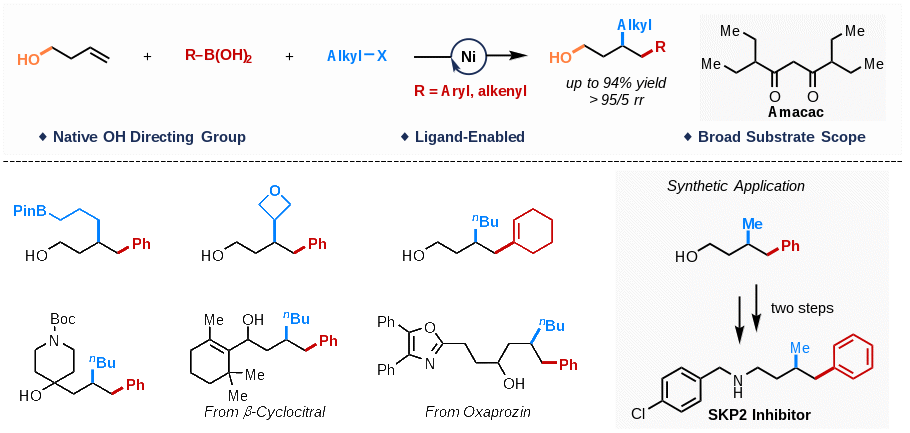 中国科学院上海有机化学研究所王鹏课题组成立以来一直致力于烯烃转化和有机硅化学方向的研究,发展基于含硅螺环大“咬合角”催化剂并利用配体“咬合角”调控策略实现了过渡金属催化烯烃不对称转化 (Angew. Chem. Int. Ed. 2020, 59, 8937; 2022, 61, e202113052; 2022, 61, e202205382; 2023, 62, e202216878; 2024, 63, e202404732; 2024, 63, e202402612; Chem 2023, 9, 3461; 2023, 9, 1452; Org. Lett. 2023, 25, 3859; 2024, 26, 7436.);同时开发阴离子型配体调控金属中心电性,通过发展一系列β-二酮配体成功实现了内烯烃与非活化烯烃的碳官能团化反应 (Angew. Chem. Int. Ed. 2020, 59, 20399; 2023, 62, e202304573; 2024, 63, e202313336; Nat. Commun. 2022, 13, 6878; 2022, 13, 5059; 2024, 15, 10333; Org. Lett. 2024, 26, 3691; Org. Lett. 2024, 26, 8171; J. Am. Chem. Soc.2025, 147, 69.)。在前期的研究中,他们发现利用大位阻β-二酮配体可以实现原生官能团例如酰胺、胺基、醇导向的芳氧化反应 (Angew. Chem. Int. Ed.2023, 62, e202304573)。在此基础上,他们进一步使用烯基醇作为底物,烷基卤代物作为亲电试剂,通过弱配位的醇导向成功实现了烯烃的1, 2-双碳官能团化反应 (Chem Catal.2025, 5, 101261.)。