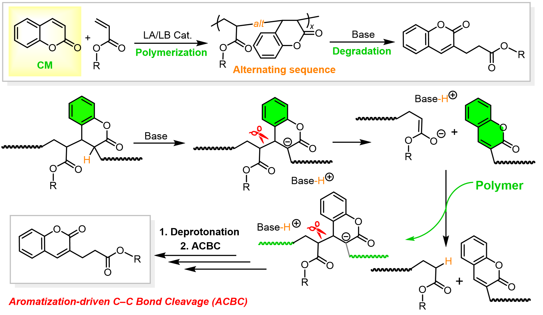 更为重要的是:当以1,5,7-三叠氮双环(4.4.0)癸-5-烯(TBD)或Cs2CO3为强碱催化剂,该全碳主链高分子在室温下即可发生按需降解,定量回收得到具有生物医用价值的二聚小分子,需要指出的是,具有常温定量降解能力的全碳主链高分子是十分罕见的,机理研究表明:从6π电子的香豆素加成片段降解成10π电子的香豆素衍生二聚体的芳构化过程,为全碳主链的高效、高选择性断裂提供了热力学驱动力,进而建立了芳构化驱动碳链断裂的新策略(Aromatization-driven C–C Bond Cleavage, ACBC),为难降解的全碳主链高分子在温和条件下的定量降解提供新思路。